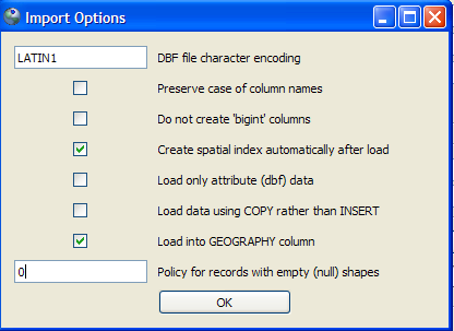 error log: Shapefile type: Polygon Postgis type: MULTIPOLYGON[2] Importing shapefile (167176 records)... Failed SQL begins: "INSERT INTO "postgres"."locations" ("objectid","uid","id_0","iso","name_0","id_1","name_1","varname_1","nl_name_1","hasc_1","cc_1","type_1","engtype_1","validfr_1","validto_1","remarks_1","id_2","name_2","varname_2","nl_name_2","hasc_2","cc_2","type_2","" Failed in pgui_exec(): ERROR: Coordinate values are out of range [-180 -90, 180 90] for GEOGRAPHY type LINE 1: ...LL,NULL,'1.64848538366e+003','6.07804729089e+003','010600000... ^ Failed record number #1963 Failed SQL begins: "INSERT INTO "postgres"."locations" ("objectid","uid","id_0","iso","name_0","id_1","name_1","varname_1","nl_name_1","hasc_1","cc_1","type_1","engtype_1","validfr_1","validto_1","remarks_1","id_2","name_2","varname_2","nl_name_2","hasc_2","cc_2","type_2","" Failed in pgui_exec(): ERROR: current transaction is aborted, commands ignored until end of transaction block Failed record number #1964 Failed SQL begins: "INSERT INTO "postgres"."locations" ("objectid","uid","id_0","iso","name_0","id_1","name_1","varname_1","nl_name_1","hasc_1","cc_1","type_1","engtype_1","validfr_1","validto_1","remarks_1","id_2","name_2","varname_2","nl_name_2","hasc_2","cc_2","type_2","" Failed in pgui_exec(): ERROR: current transaction is aborted, commands ignored until end of transaction block